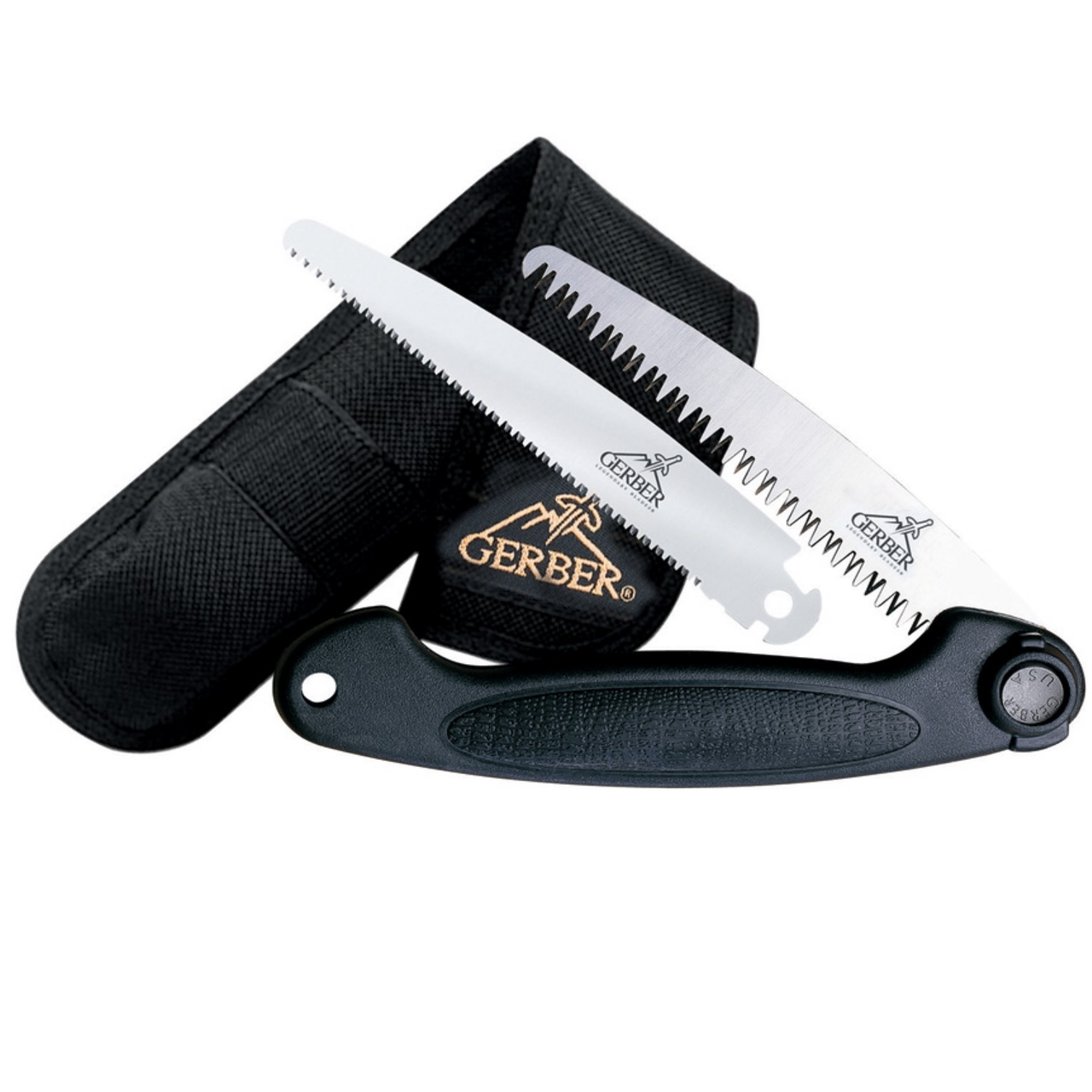 GERBER EXCHANGE A BLADE , SIERRA PLEGABLE DE HOJAS INTERCAMBIABLES Y BLOQUEABLES, DISEÑO EN DONDE LA HOJA DE SIERRA SE PLIEGA DENTRO DEL MANGO CUANDO NO ESTA EN USO, AL ABRIR LA HOJA SE BLOQUEA COMO UNA NAVAJA, CUENTA CON DOS HOJAS , HOJA DE DIENTE FINO PARA MADERAS DURAS O HUESO Y HOJA DE DIENTE GRANDE PARA MADERAS MAS SUAVES, MANGO DE FRN COLRO NEGRO Y HOYO PARA LANYARD, INCLUYE FUNDA NYLON